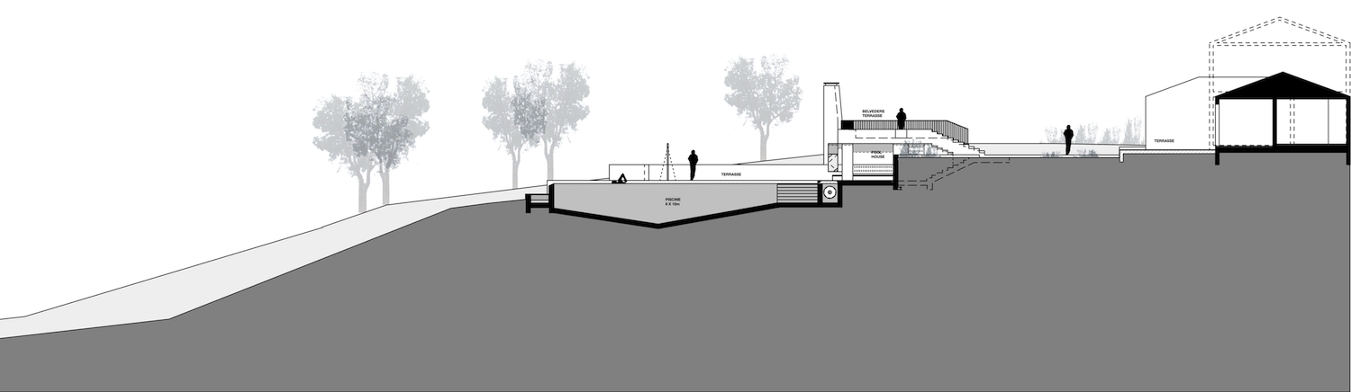 White reinforced concrete is used to form the pool house structure and adjacent retaining walls, an integrated solution that makes reference to the rendered provincial houses in the region, while resolving the technical requirements of the structure. At roof level the pool house projects out of the ground slightly to provide a raised terrace with adjacent garden, an alternative vantage point at which to relax. The sculptural form, with stairs and chimney creates a kind of folly in the landscape; with smoke rising from the fire signalling that evening drinks are being served below.